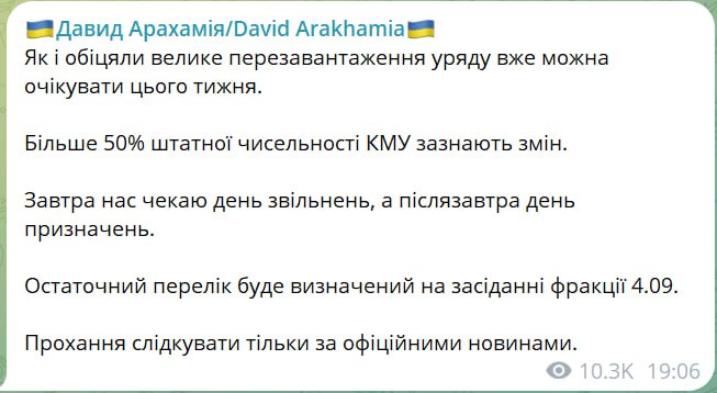 "Как и обещали, большую перезагрузку правительства уже можно ожидать на этой неделе. Более 50% штатной численности КМУ претерпевают изменения. Завтра нас ждет день увольнений, а послезавтра день назначений. Окончательный список будет определен на заседании фракции 4.09", – написал он.