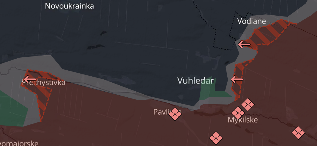 Российские войска захватили Пречистовку к западу от Угледара и продвинулись в районе Водяного к северо-востоку от Угледара. Также они приблизились к Угледару с востока, сообщает украинский военный паблик Deep State.