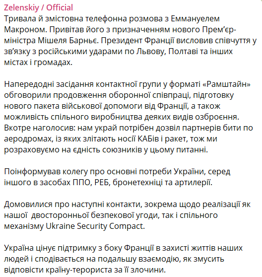 «В преддверии заседания контактной группы в формате «Рамштайн» обсудили продолжение оборонного сотрудничества, подготовку нового пакета военной помощи от Франции, а также возможность совместного производства некоторых видов вооружения. Еще раз подчеркнул: нам крайне нужно разрешение партнеров бить по аэродромам, с которых взлетают носители КАБов и ракет, поэтому мы рассчитываем на единство союзников в этом вопросе», – рассказал украинский президент.