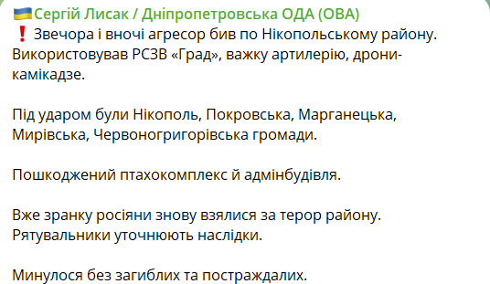"Под ударом были Никополь, Покровская, Марганецкая, Мировская, Красногригорьевская громады. Поврежден птицекомплекс и админздание", - написал он.