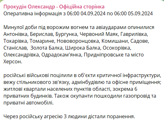 08:25 В Херсонской области в результате обстрелов РФ три человека получили ранения. Об этом сообщает глава ОВА Александр Прокудин.