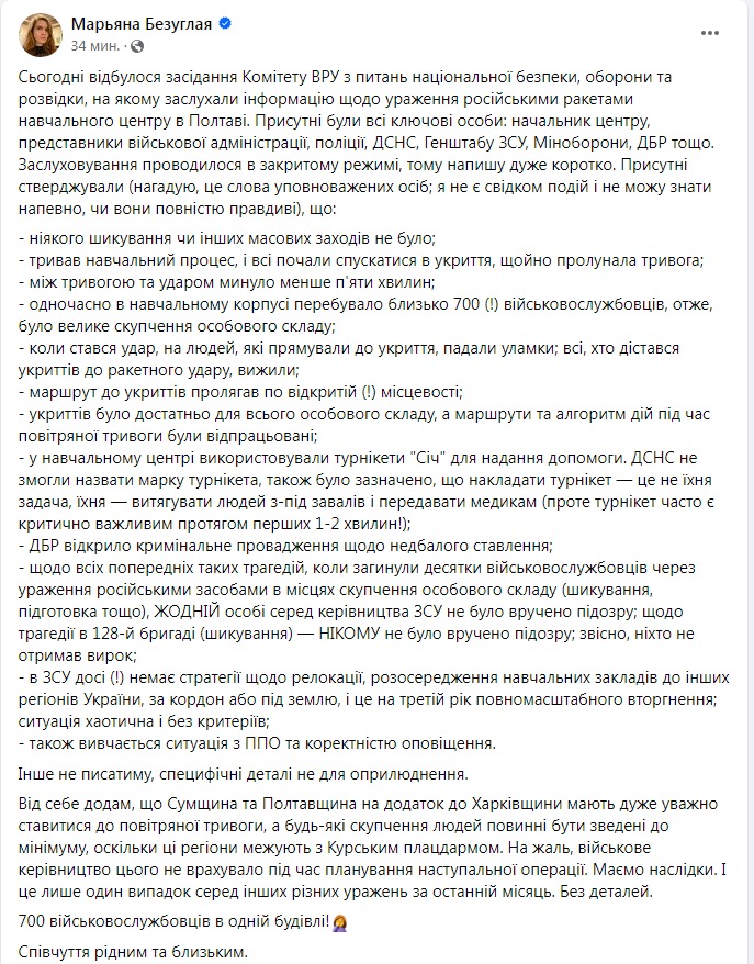 Комитет Верховной Рады по вопросам национальной безопасности, обороны и разведки провел заседание, на котором обсуждали ситуацию с ударом по военному институту связи в Полтаве.