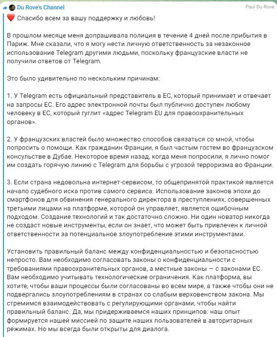 "В прошлом месяце меня допрашивала полиция в течение четырех дней после прибытия в Париж. Мне сказали, что я могу нести личную ответственность за незаконное использование Telegram другими людьми, поскольку французские власти не получили ответов от Telegram. Это было удивительно по нескольким причинам: