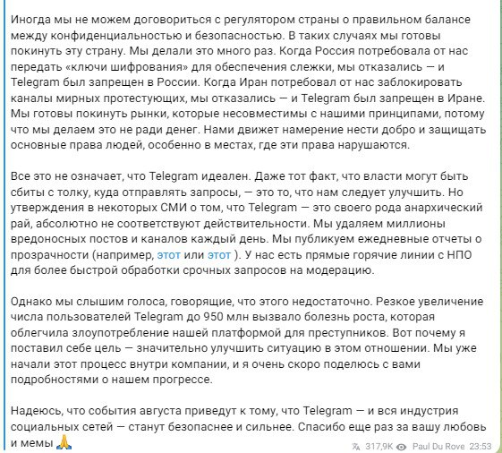 "Мы стремимся взаимодействовать с регулирующими органами, чтобы найти правильный баланс. Да, мы придерживаемся наших принципов: наш опыт формируется нашей миссией по защите наших пользователей в авторитарных режимах. Но мы всегда были открыты для диалога. Иногда мы не можем договориться с регулятором страны о правильном балансе между конфиденциальностью и безопасностью. В таких случаях мы готовы покинуть эту страну. Мы делали это много раз. Когда Россия потребовала от нас передать "ключи шифрования" для обеспечения слежки, мы отказались – и Telegram был запрещен в России. Когда Иран потребовал от нас заблокировать каналы мирных протестующих, мы отказались – и Telegram был запрещен в Иране. Мы готовы покинуть рынки, которые несовместимы с нашими принципами, потому что мы делаем это не ради денег", – объяснил Дуров.