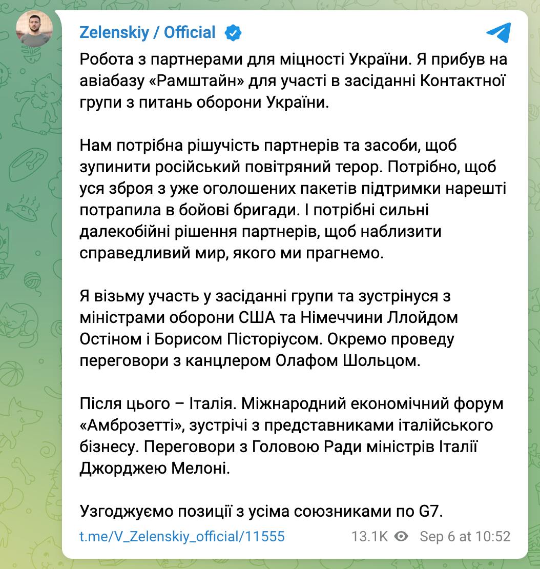 Сегодня, 6 сентября, президент Украины Владимир Зеленский прибыл в Германию на очередное заседание "Рамштайна".