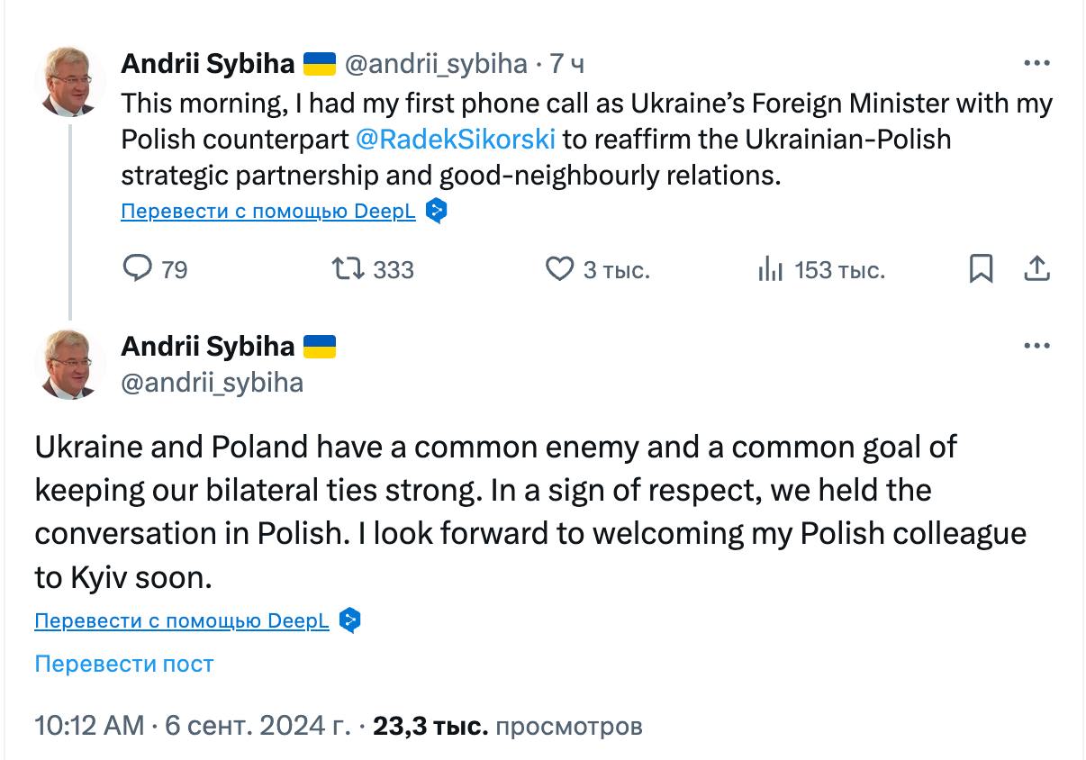 "Сегодня утром у меня был первый телефонный разговор в качестве министра иностранных дел Украины с моим польским коллегой, чтобы подтвердить украинско-польское стратегическое партнерство и добрососедские отношения. У Украины и Польши есть общий враг и общая цель — поддерживать наши двусторонние связи крепкими. В знак уважения мы вели разговор на польском языке. Я с нетерпением жду возможности вскоре приветствовать своего польского коллегу в Киеве", - написал Сибига.