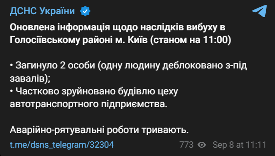 Сегодня утром в Голосеевском районе Киева на территории автопредприятия произошел взрыв. Погибли два человека.