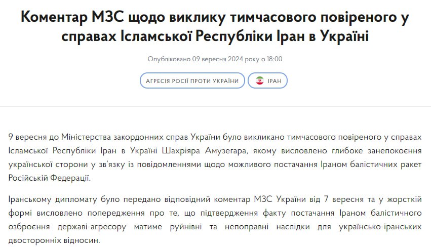 "Послу высказана глубокая обеспокоенность украинской стороны в связи с сообщениями о возможном снабжении Ираном баллистическими ракетами Российской Федерации. Иранскому дипломату в жесткой форме высказано предупреждение о том, что подтверждение факта будет иметь разрушительные и непоправимые последствия для украинско-иранских двусторонних отношений", - говорится в заявлении дипломатического ведомства.