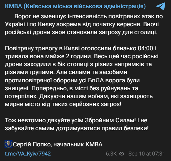 08:30 Сегодня ночью россияне атаковали Киев ударными БПЛА. Об этом сообщает глава КГВА Сергей Попко.