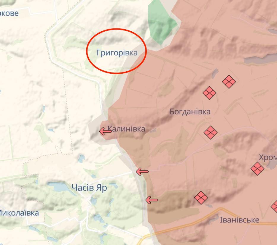 Григоровка находится севернее Часового Яра. На карте DS указано, что село находится на линии фронта, но остается под контролем ВСУ.