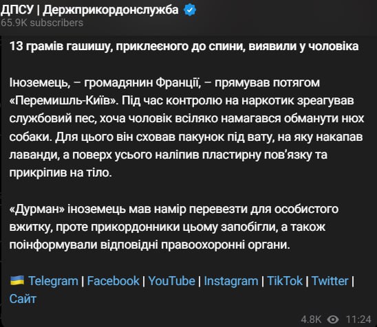 Ранее на границе мужчина пытался провезти гашиш в пакетике, проглотив его, но наркотик учуяла служебная собака. Попытку перемещения через украинско-польскую границу наркотического вещества пресекли в пункте пропуска "Краковец". Задержанным оказался 61-летний уроженец города Сумы.