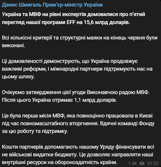 "Средства партнеров помогают нашему правительству финансировать все не военные расходы бюджета. Это позволяет направлять наши внутренние ресурсы на обороноспособность страны", - добавил Шмыгаль.