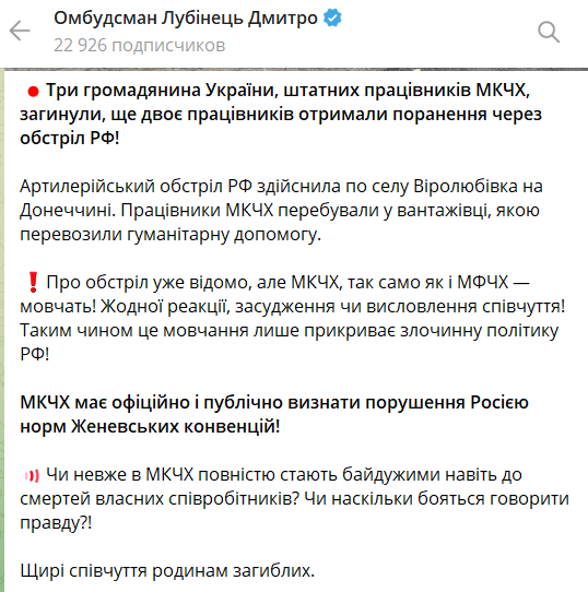 Лубинец осудил Международный комитет Красного Креста за то, что тот не отреагировал на обстрел и гибель своих сотрудников.