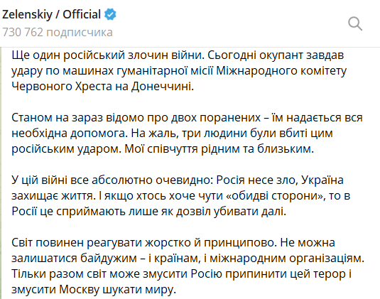 Президент Украины Владимир Зеленский уже заявил, что сотрудники Красного Креста погибли в результате российского удара.