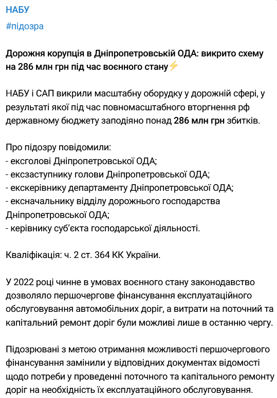 Национальное антикоррупционное бюро Украины (НАБУ) и Специализированная антикоррупционная прокуратура (САП) разоблачили масштабную аферу в дорожной сфере, в результате которой во время войны государственному бюджету принесли более 286 миллионов гривен убытков.