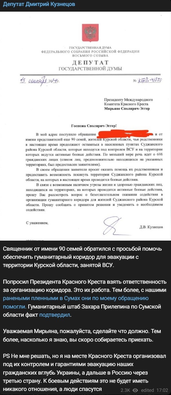 По словам Кузнецова, к нему обратился священник, который, от имени 90 семей Курской области, попросил помочь обеспечить гуманитарный коридор.