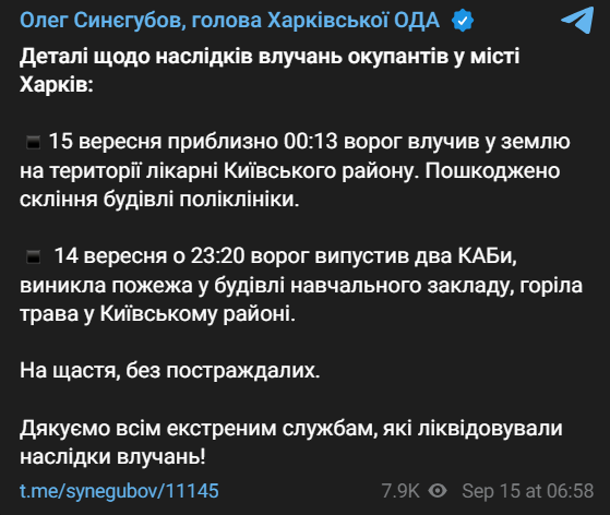 14 сентября в 23:20 россияне выпустили два КАБа, возник пожар в здании учебного заведения, горела трава в Киевском районе.