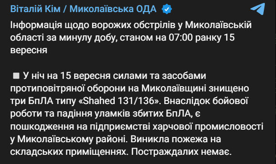 08:15 В Николаевской области ночью были сбиты три БПЛА типа "Shahed 131/136". Об этом сообщает глава ОВА Виталий Ким.