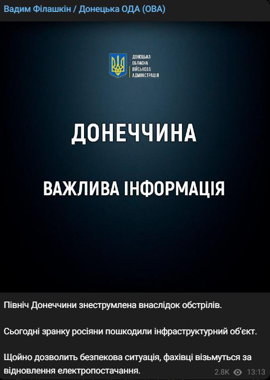 14:47 Северная часть Донецкой области обесточена в результате обстрелов, сообщает глава ОВА Вадим Филашкин.