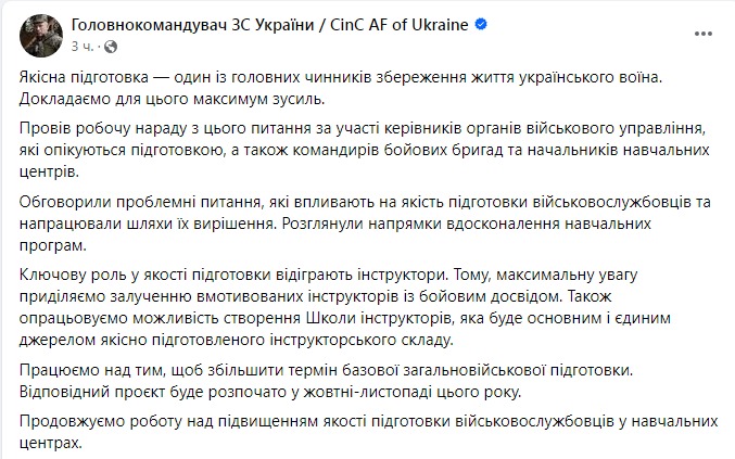 "Провел рабочее совещание по этому вопросу с участием руководителей органов военного управления, которые занимаются подготовкой, а также командиров боевых бригад и начальников учебных центров. Обсудили проблемные вопросы, влияющие на качество подготовки военнослужащих и наработавшие пути их решения. Рассмотрели направления усовершенствования учебных программ. Ключевую роль в качестве подготовки играют инструкторы. Поэтому максимальное внимание уделяем привлечению мотивированных инструкторов с боевым опытом. Также прорабатываем возможность создания Школы инструкторов, которая станет основным и единственным источником качественно подготовленного инструкторского состава", - сказано в публикации.