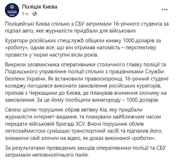 Полицейские Киева совместно с СБУ задержали 16-летнего студента за поджог автомобиля, который журналисты приобрели для военных.