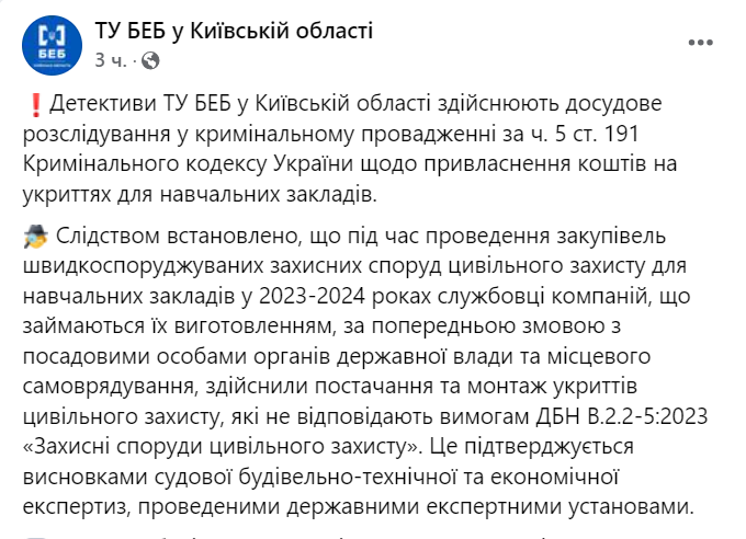 В Киевской области раследуют растрату более 20 миллионов на строительстве укрытий. Фото: БЭБ