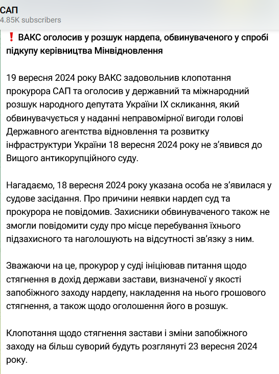 Об этом сообщает Специализированная антикоррупционная прокуратура (САП).