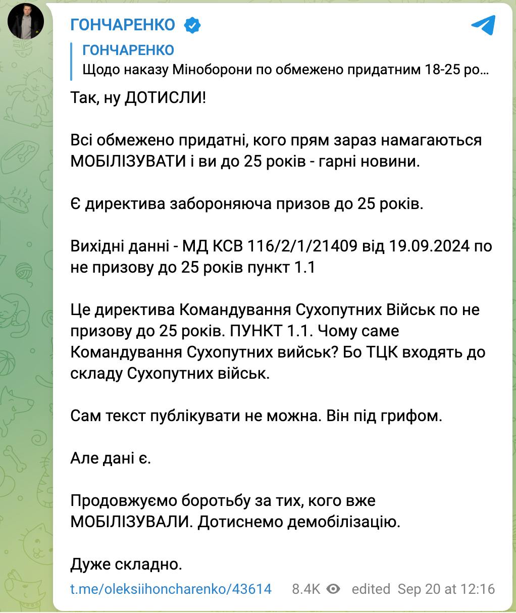 То есть пока освободили только одну категорию парней младше 25 лет. О демобилизации уже призванных ничего не говорится.