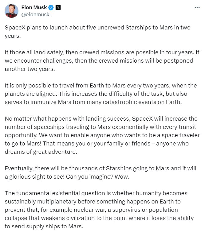 По словам Маска, если полеты и посадка всех пяти аппаратов на Красную планету пройдут успешно, то через четыре года последуют миссии с экипажем.