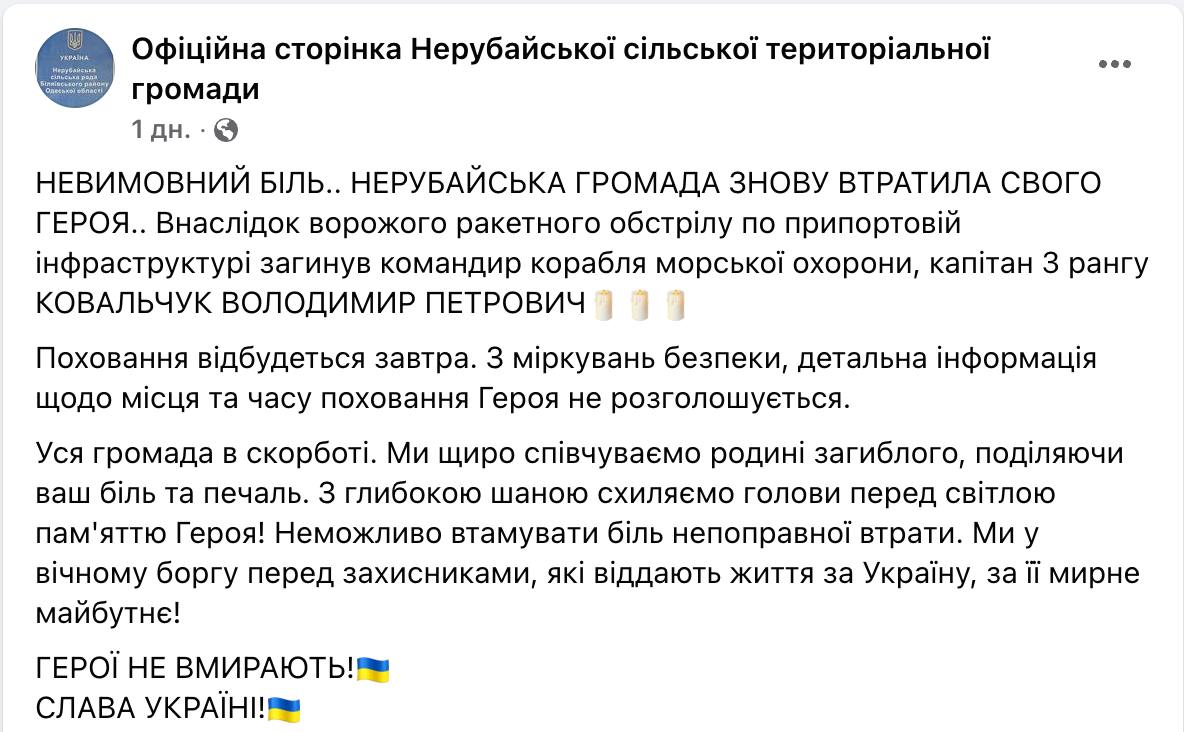 "В результате вражеского ракетного обстрела по припортовой инфраструктуре погиб командир корабля морской охраны, капитан 3-го ранга Ковальчук Владимир Петрович", - говорится в опубликованном вчера посте.