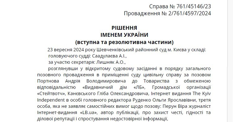 Как отмечено в решении, суд признал недостоверной и порочащей честь, достоинство и деловую репутацию Портнова, распространенную на веб-сайтах The Kyiv Independent в публикации под названием: "Украина вводит санкции против мелких пророссийских политиков, оставляя без внимания наиболее известные фигуры", а также в похожей публикации на сайте "Левого берега".