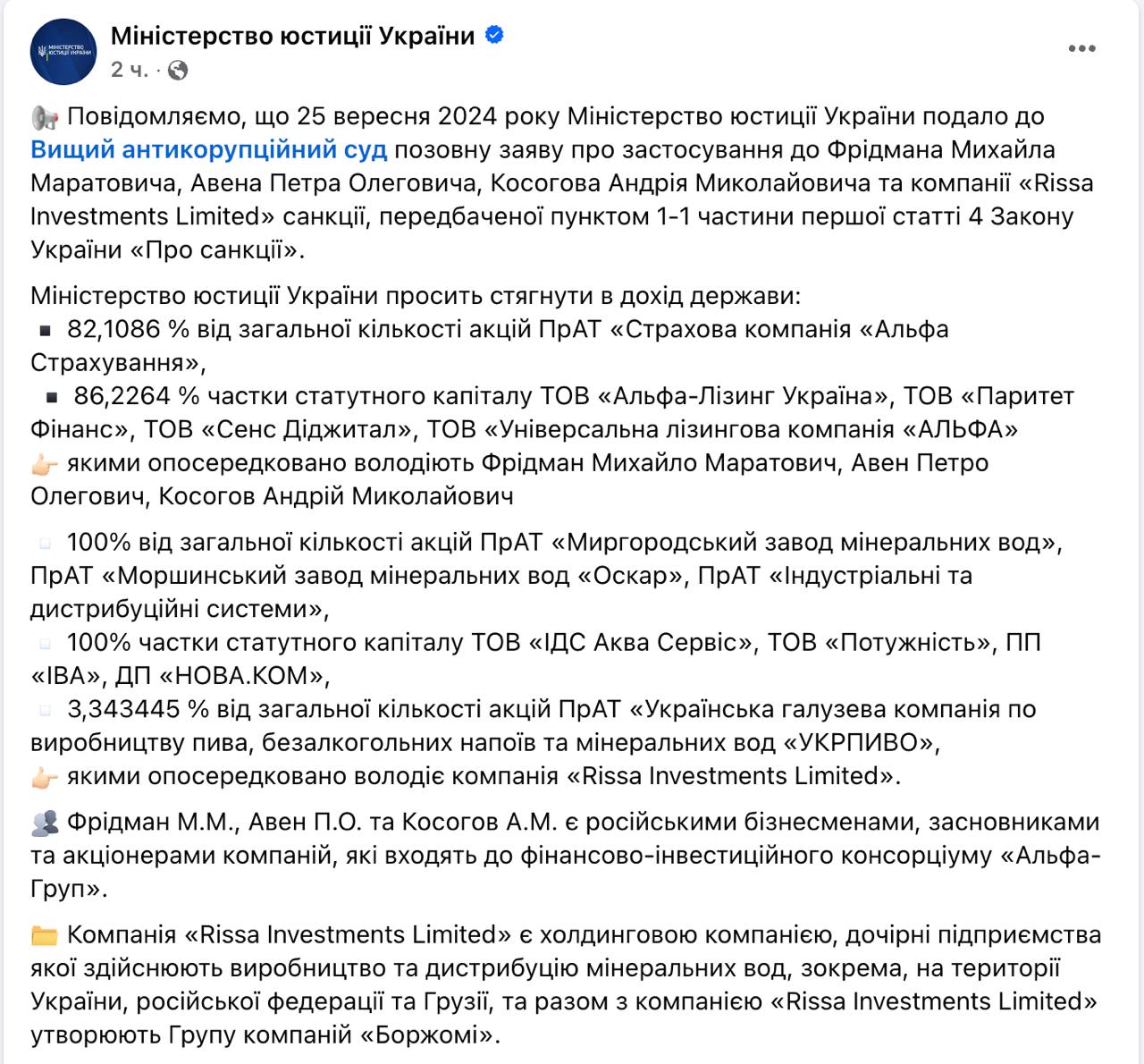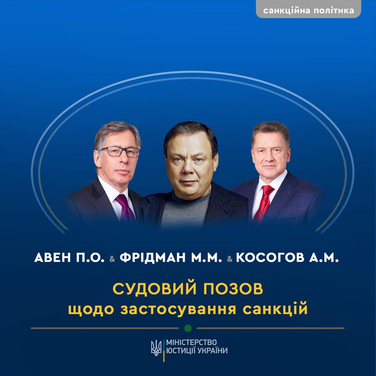 Минюст попросил Высший антикоррупционный суд взыскать в доход государства украинские активы российских бизнесменов. Кроме Фридмана, это также Петр Авен и Андрей Косогов. Речь идет о следующих предприятиях: