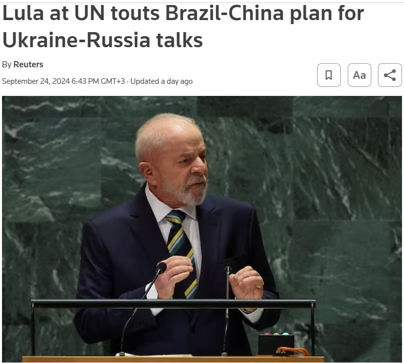 Напомним, накануне во время выступления в ООН президент Бразилии Лула да Силва призвал приступить к реализации мирного плана, предложенного его страной и КНР, который предполагает остановку боевых действий по линии фронта.