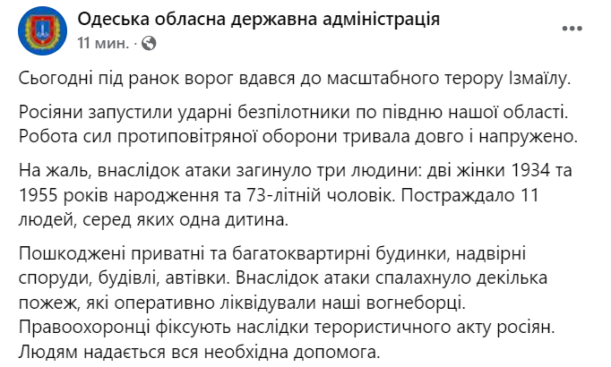 Сегодня россияне атаковали ударными беспилотниками Измаил Одесской области. Погибли три человека, пострадали 11.