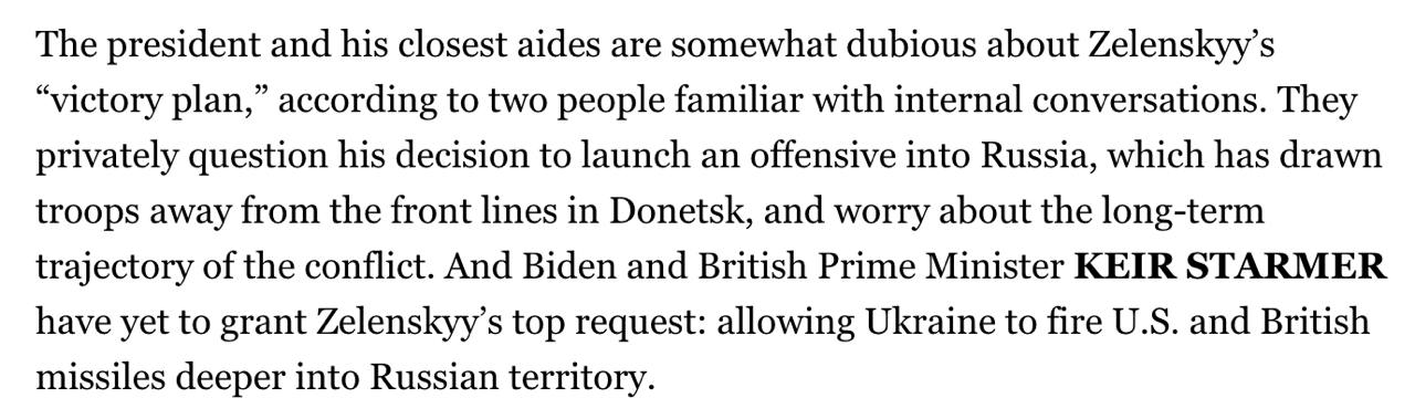 Также издание пишет, что Байден и его окружение с "сомнением" относятся к "плану победы" президента Владимира Зеленского и решению вторгнуться в Курскую область.