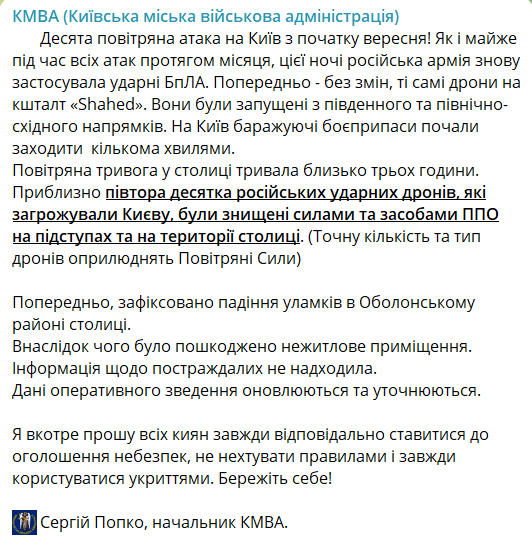 08:09 Ночью Киев атаковали дроны, обломки упали на Оболони. Повреждено нежилое здание, заявили власти.