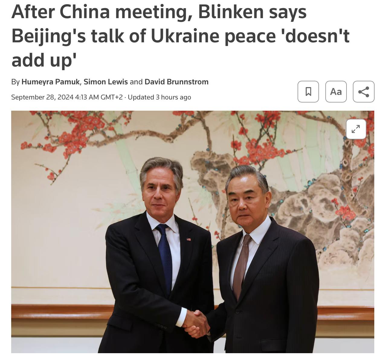 На встрече с министром иностранных дел КНР Ван И он заявил, разговоры Пекина о мире в Украине "не сходятся" с тем, что Китай поддерживает военно-промышленный комплекс России.