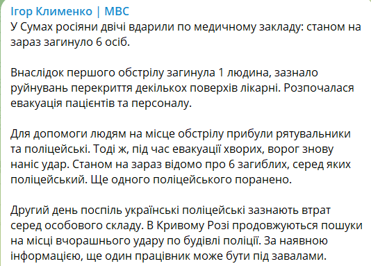 Сегодня утром россияне дважды ударили по медучреждению в Сумах. Погибли шесть человек. Об этом сообщает министр внутренних дел Игорь Клименко.