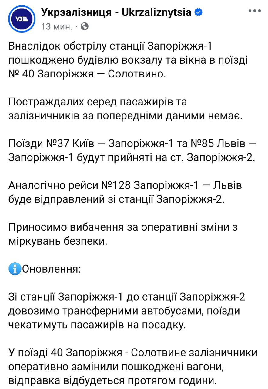 В "Укрзализныце" сообщили, что одной из целей российских авиабомб в Запорожье стала железнодорожная станция "Запорожье-1".