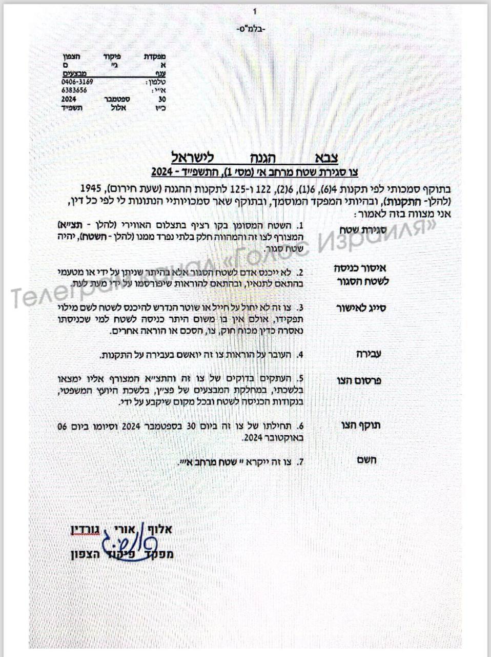 В соответствии с оценкой ситуации принято решение о создании закрытой военной зоны в районе Метулы, Мешгав-Ама и Кфар-Гилади. В ЦАХАЛ уточняют, что вход в эту зону строго запрещен.
