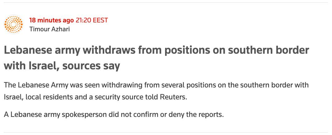 Тем временем агентство Reuters со ссылкой на местных жителей и другие источники пишет, что ливанская армия отходит с нескольких позиций на юге страны на границе с Израилем.