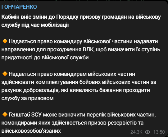 Кабинет министров внес изменения в Порядок призыва граждан на военную службу во время мобилизации. Об этом сообщает народный депутат Алексей Гончаренко.