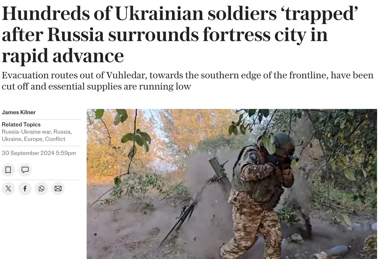 А, по данным британской The Telegraph, сотни украинских военных оказались в Угледаре " в ловушке", так как пути эвакуации из города отрезаны, а запасы продовольствия, боеприпасов и топлива уже на исходе.