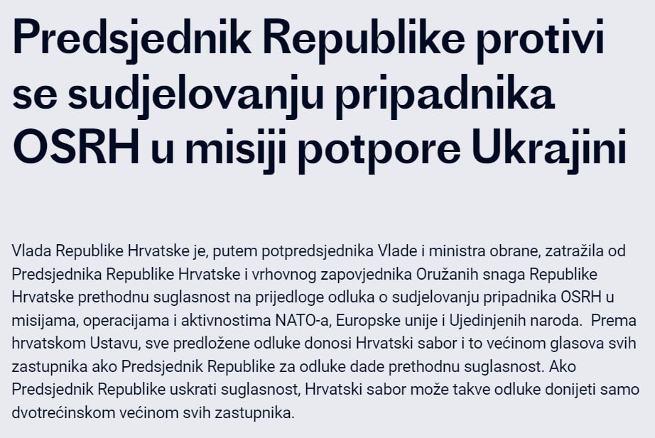 "Президент республики не дал предварительного согласия лишь на решение об участии представителей Вооруженных сил Хорватии в деятельности НАТО по обеспечению безопасности и учебной поддержке Украины. Правительство хочет отправить военнослужащих Хорватии с миссией по поддержке Украины, но реализация такого решения находится в компетенции президента республики как верховного главнокомандующего, и он принял решение в рамках его конституционных полномочий не давать согласия на участие хорватов в миссии, которая потенциально может нанести вред национальным интересам Республики. Согласно Конституции, правительство может попросить хорватский парламент проголосовать по предложенному решению, и если предложенное правительством решение получит поддержку двух третей членов парламента, решение вступит в силу, и президент обязан принять его", - сказано в публикации.