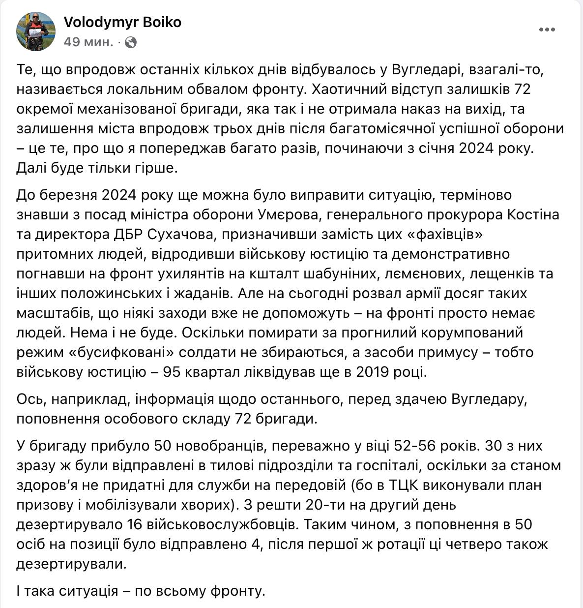 "Информация о последнем, перед сдачей Угледара, пополнении личного состава 72-й бригады. В бригаду прибыли 50 новобранцев, преимущественно в возрасте 52-56 лет. 30 из них сразу же были отправлены в тыловые подразделения и госпитали, поскольку по состоянию здоровья не пригодны для службы на передовой (потому что в ТЦК выполняли план призыва и мобилизовали больных). Из остальных 20-ти на второй день дезертировали 16 военнослужащих. Таким образом из пополнения в 50 человек на позиции были отправлены 4, после первой же ротации эти четверо также дезертировали", - пишет Бойко.