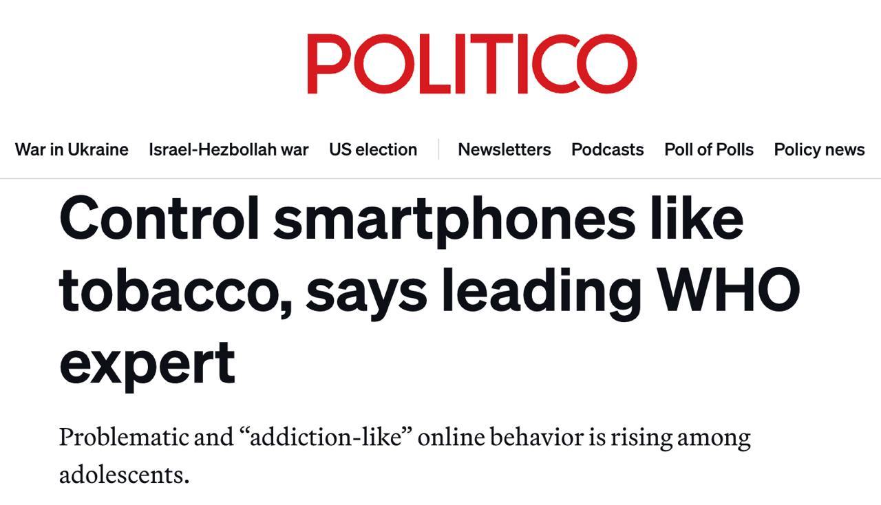 Директор ВОЗ по системам и политике здравоохранения в странах Европейского региона Наташа Аццопарди-Мускат заявила о растущем негативном влиянии игр и социальных сетей на психическое здоровье детей. Она считает необходимым вводить возрастные ограничения, контролировать цены и создавать зоны, где использование смартфонов запрещено.
