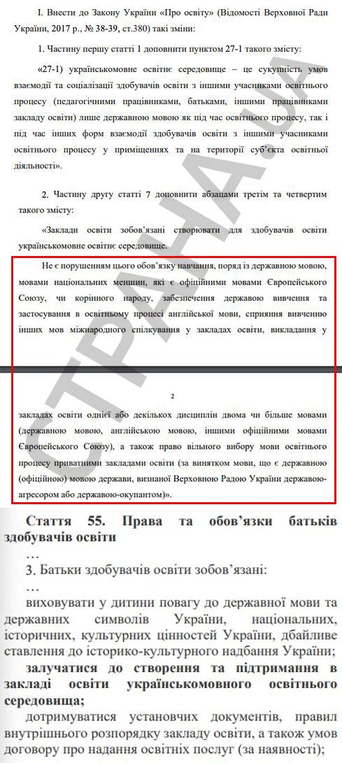 Она предлагает таким образом выполнять прописанное в законе обязательство создавать "украиноязычную образовательную среду". При этом, как говорится в законопроекте, "не является нарушением этого обязательства обучение наряду с государственным языком на языках национальных меньшинств, которые являются официальными языками Европейского Союза или коренного народа".