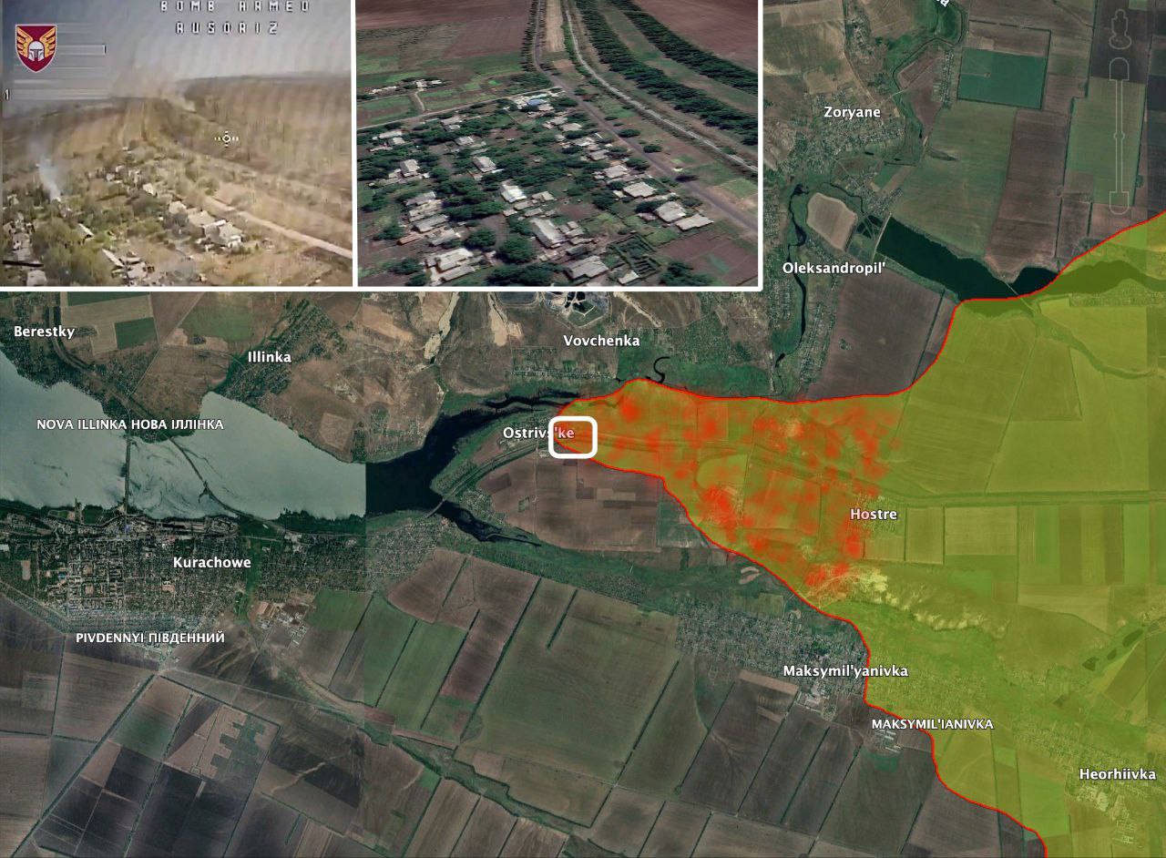Российские военные телеграм-каналы пишут, что россияне закрепились в Островском и тем самым перерезали трассу снабжения ВСУ в районе реки Волчья. Из-за этого сейчас украинская группировка в Горняке и Кураховке снабжается по единственной дороге, которая идет к северу от Кураховского водохранилища. Россияне усиленно атакуют в направлении этой трассы и в целом на юг по направлению к Курахово.
