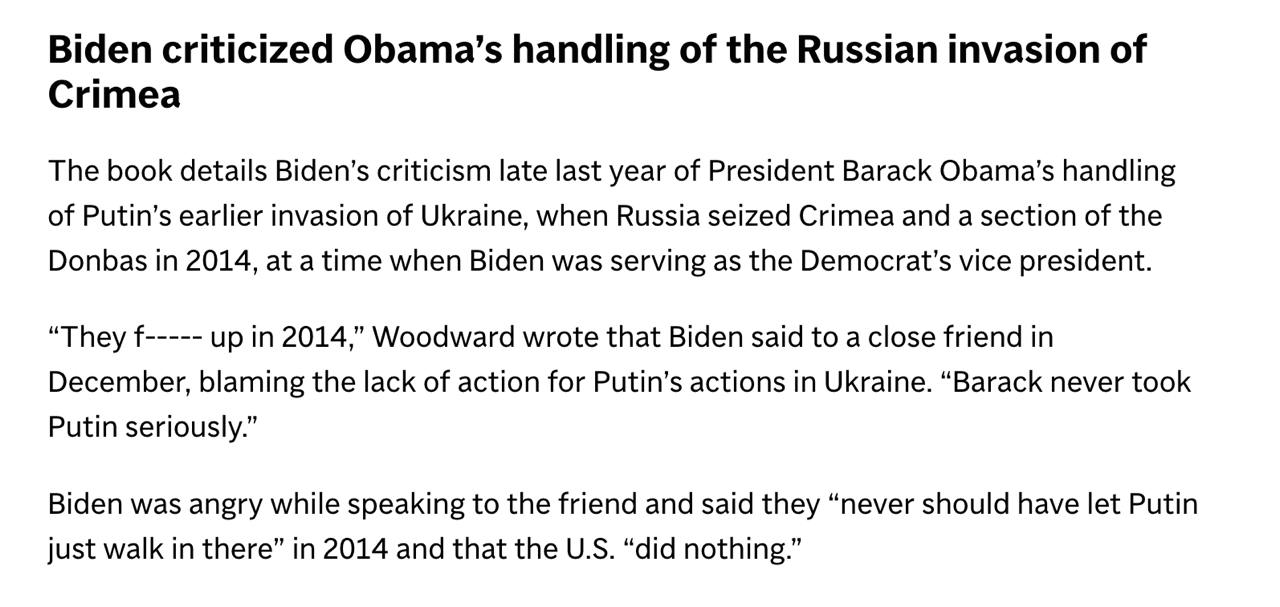 "Они прое@ались (fucked up) в 2014 году. Барак никогда не воспринимал Путина всерьез", - якобы говорил Байден, пребывая "в ярости".