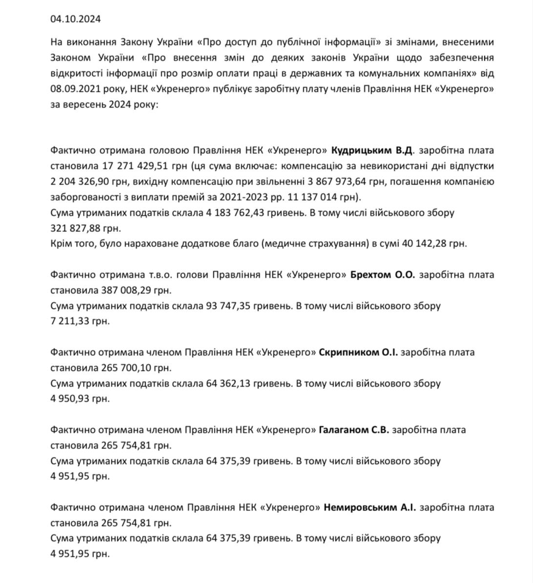 В документе не сообщается, являются ли данные выплаты экс-главе НЭК окончательными или же планируется продолжение этих выплат в следующем месяце.